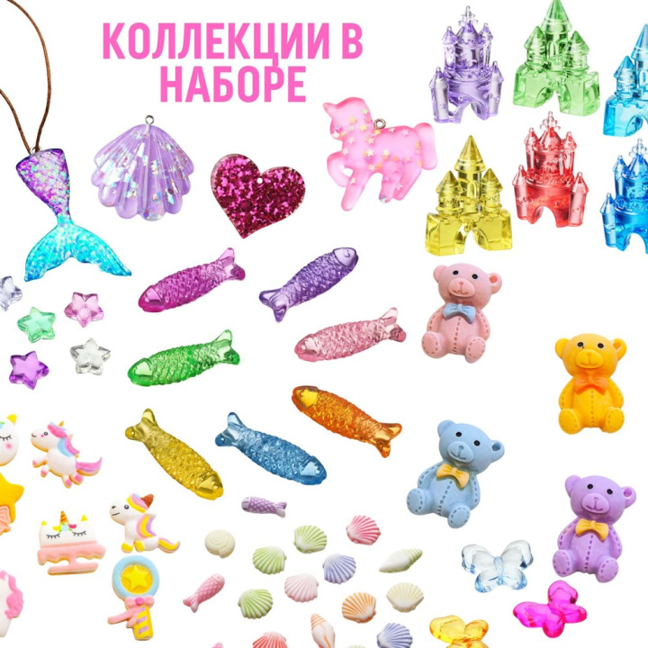 На дверцах изображены возможные находки, а внутри ребёнка ждут подвески-единорожки и ракушки, милые мишки, хвостик русалки, бабочки и фигурки сказочных замков.