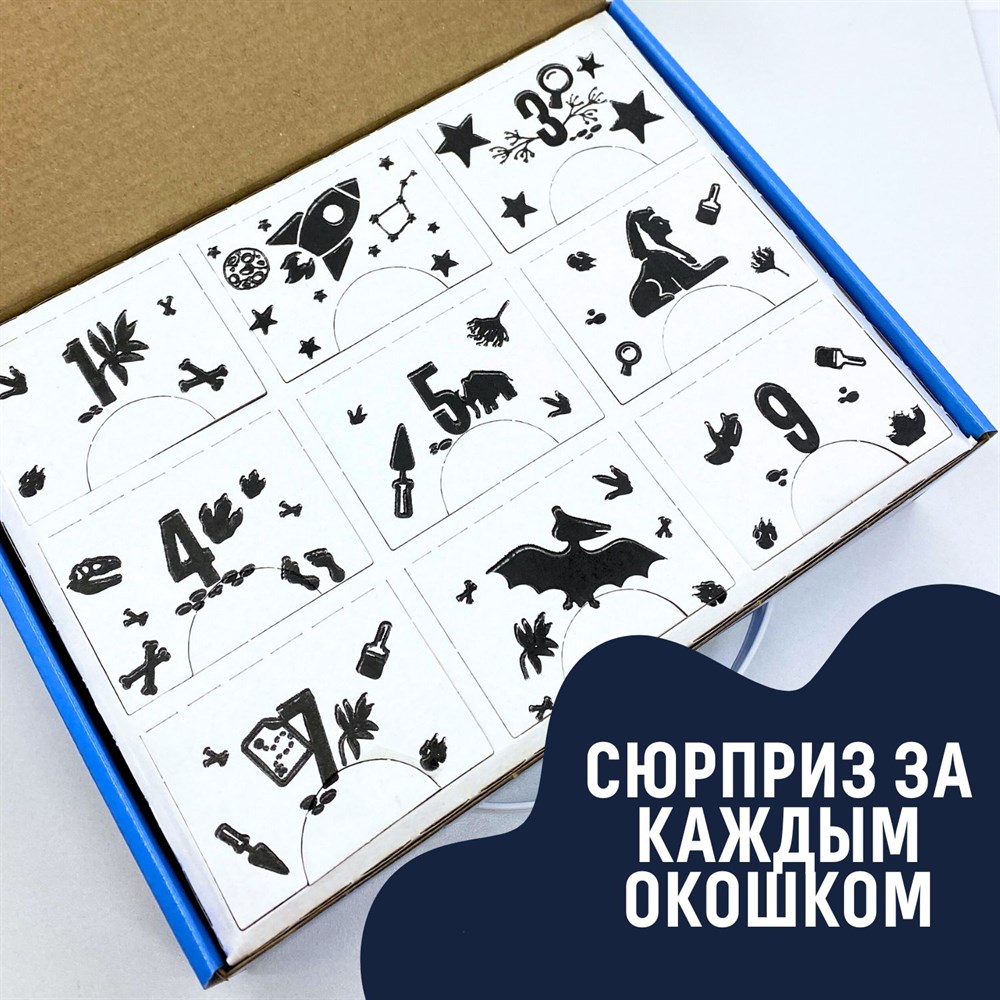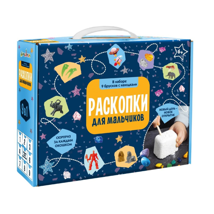 Это не просто набор, а целое приключение: внутри — 9 гипсовых брусков и 9 инструментов для раскопок, спрятанных за пронумерованными окошками.