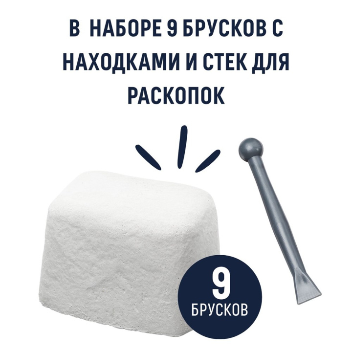 В наборе: 9 брусков для раскопок, 9 инструментов для раскопок, находки в ассортименте