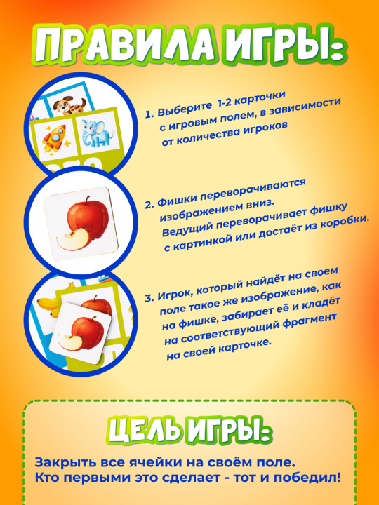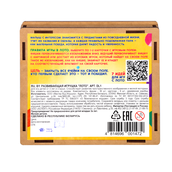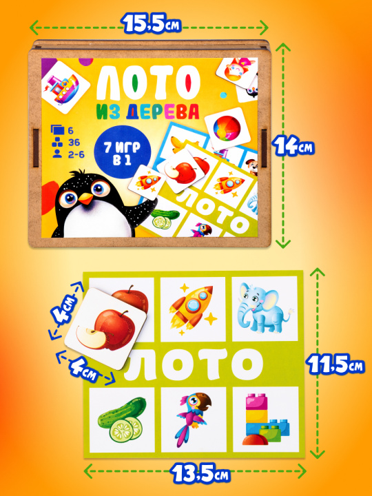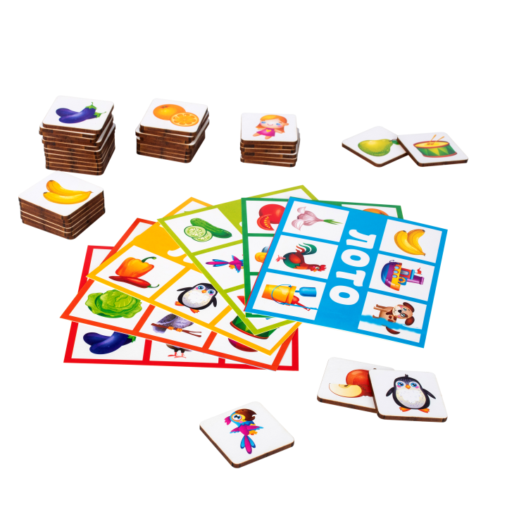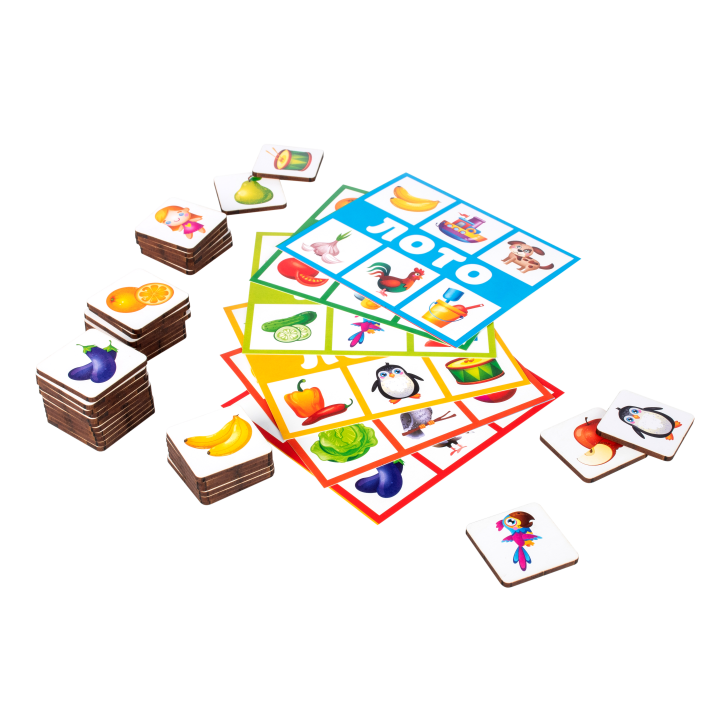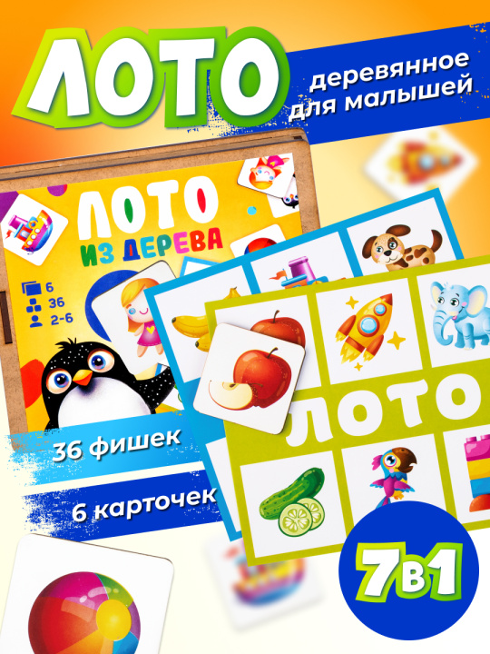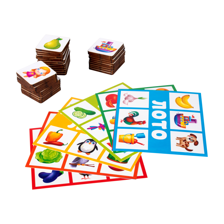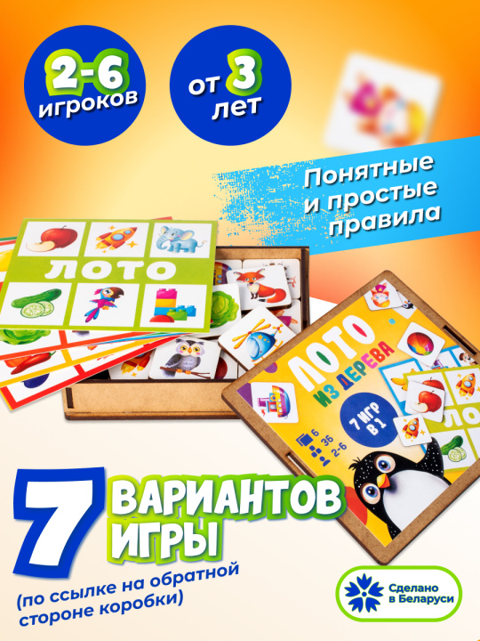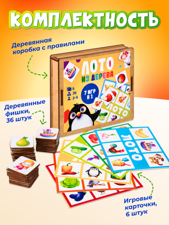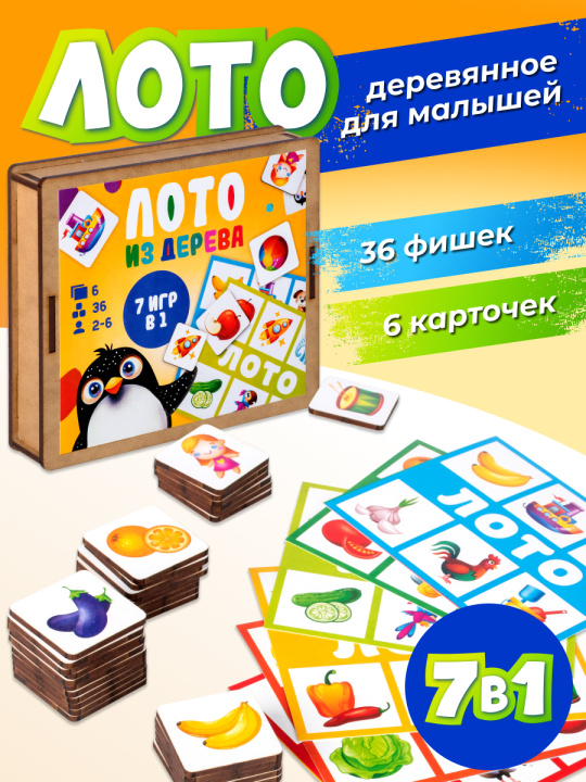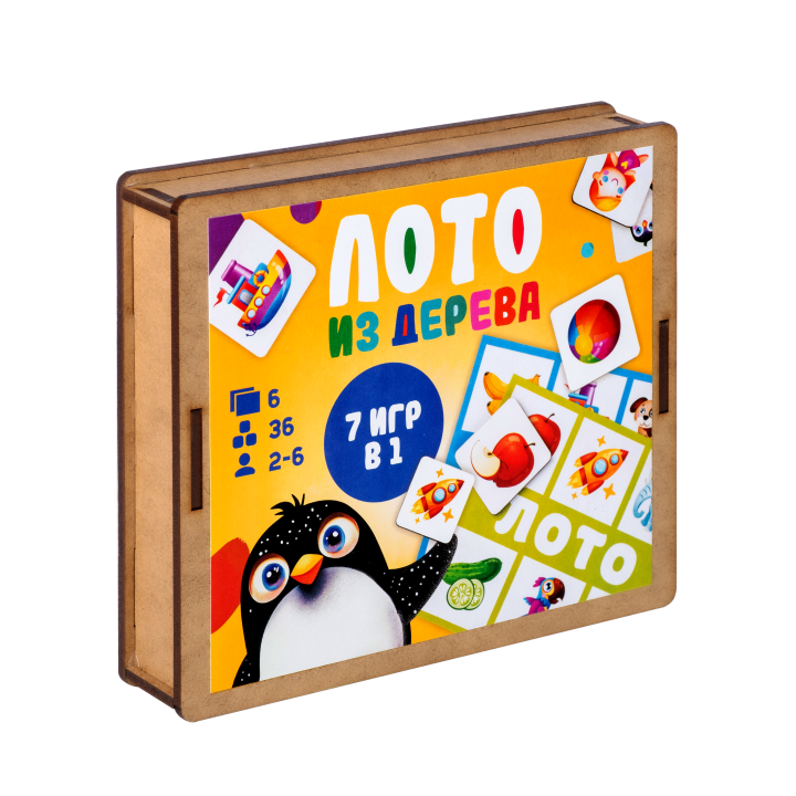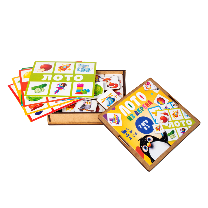 В наборе: фишки 36 шт., карточки 6 шт., деревянная коробка.