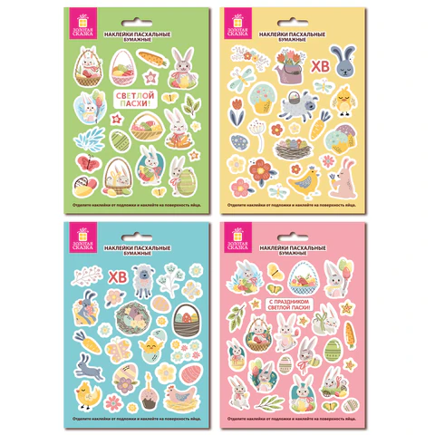 На листе формата 21х14,8 см расположены наклейки в весёлых и жизнерадостных дизайнах: забавные цыплята, милые кролики, пёстрые яички и нежные цветочные узоры – всё, чтобы передать дух светлого праздника (поставляются в 4 дизайнах ассорти, без возможности выбора). Яркие краски и праздничные мотивы мгновенно создадут атмосферу весны и радости. Размер каждой наклейки – до 3 см. Наклейки выполнены на самоклеящейся бумаге: просто оторвите по контуру и приклейте!