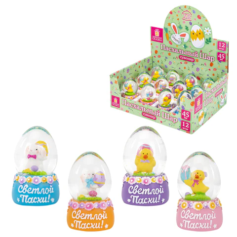 Сувенир представляет собой стеклянный шар со сказочной композицией из фигурок пасхальных персонажей внутри. На подставках, украшенных весенними цветами, написаны пожелания к празднику! Сувенир представлен в 4 уникальных дизайнах в ассортименте – каждый из них передаёт дух светлого праздника: пасхальные яйца, цветочные мотивы, цыплята, барашки, символы возрождения и весны.