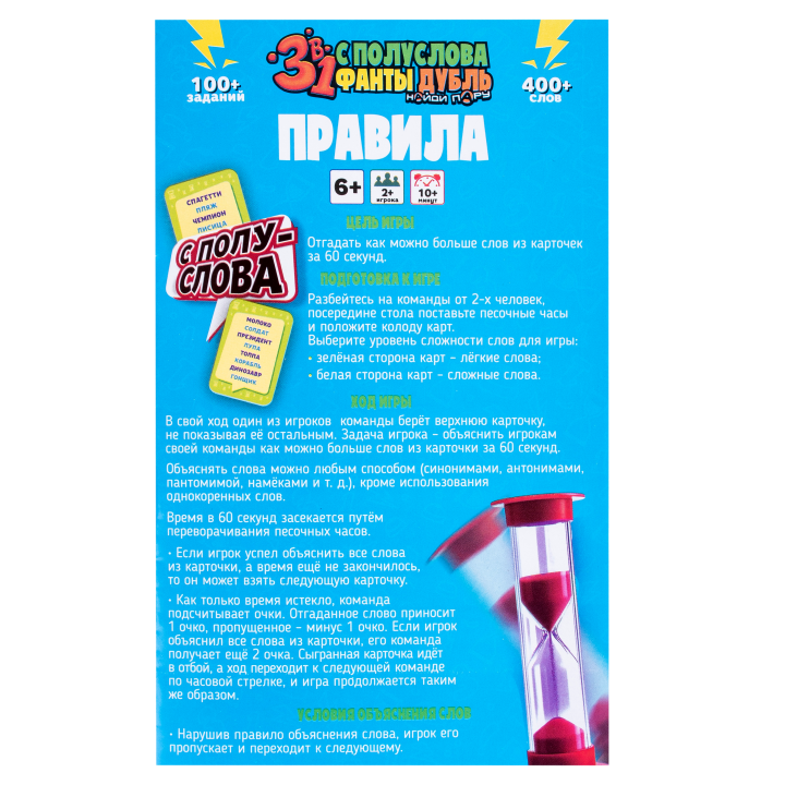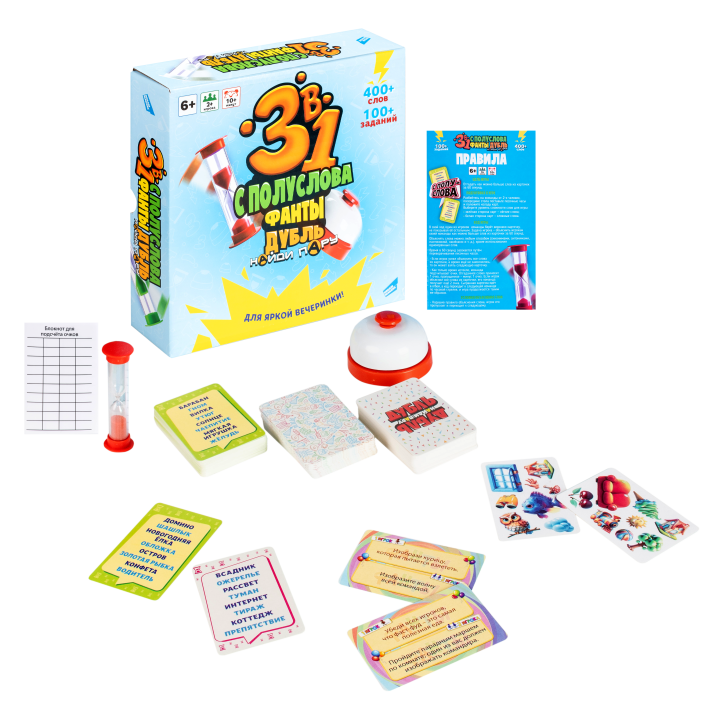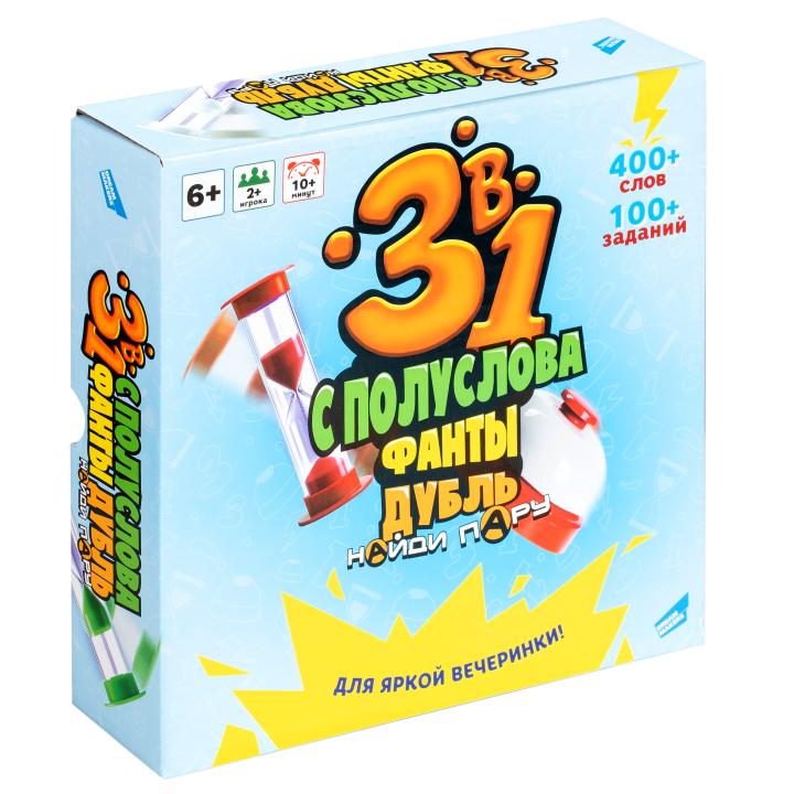 Универсальный игровой набор, объединяющий три различных формата игры для компании от 2 человек. Динамичные раунды, творческие объяснения и интеллектуальные задания подойдут для разных возрастов и настроений. Простые правила позволяют начать играть сразу после открытия коробки.