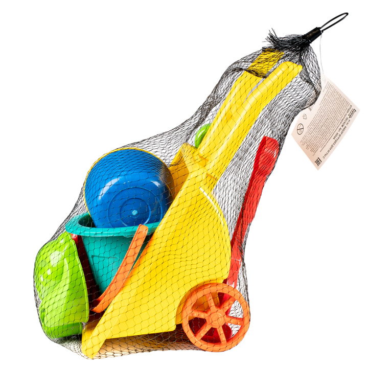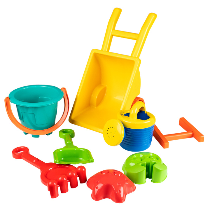 В набор входит тачка, ведро, лейка, 2 формочки, лопатка и грабли.