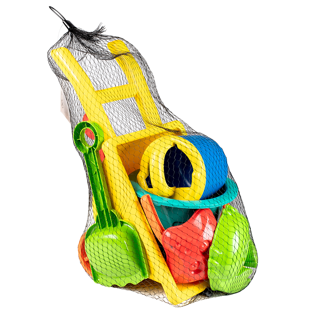 В набор входит тачка, ведро, лейка, 2 формочки, лопатка и грабли.