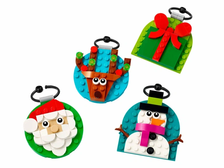 Рождественские игрушки (40744) для конструирования, предназначенным для девочек и мальчиков от 6 лет, который дает детям возможность собрать 4 подвесных украшения и хранить их долгие годы. Детям понравится собирать игрушки, а затем оформлять их в виде популярных рождественских мотивов: подарка, Санта‑Клауса, оленя и снеговика. Игрушка‑подарок украшена бантом, игрушка‑Санта‑Клаус с шапкой и белой бородой, игрушка‑снеговик в шарфе и с морковкой вместо носа, а игрушка‑олень с украшенными рогами.