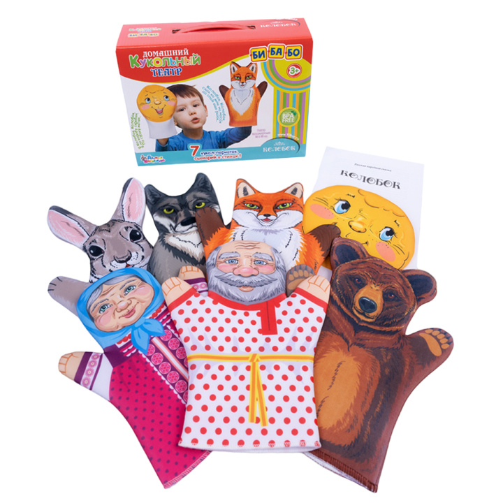 В комплект входят 7 кукол-перчаток (дед, бабка, колобок, заяц, волк, медведь и лиса), а также дополнительные материалы: весёлый стихотворный сценарий для постановки спектакля по русской народной сказке «Колобок».