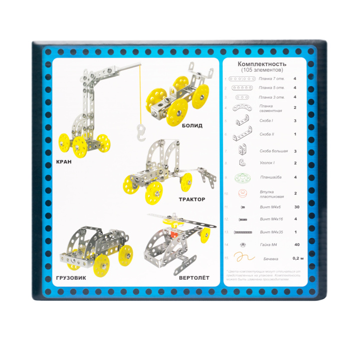 Все детали серии металлических конструкторов имеют единый формат: размер варьируется от 2 до 15 см, толщина – 0,8 мм, расстояние между центрами отверстий – 10 мм. Крепёж имеет резьбу М4, длина болтов варьируется от 6 до 35 мм, а длина шпильки составляет 75 мм.
