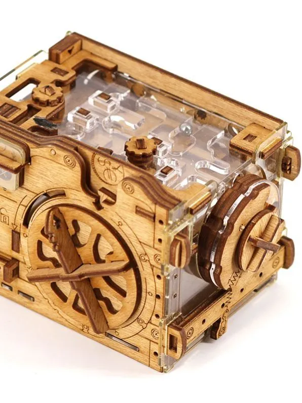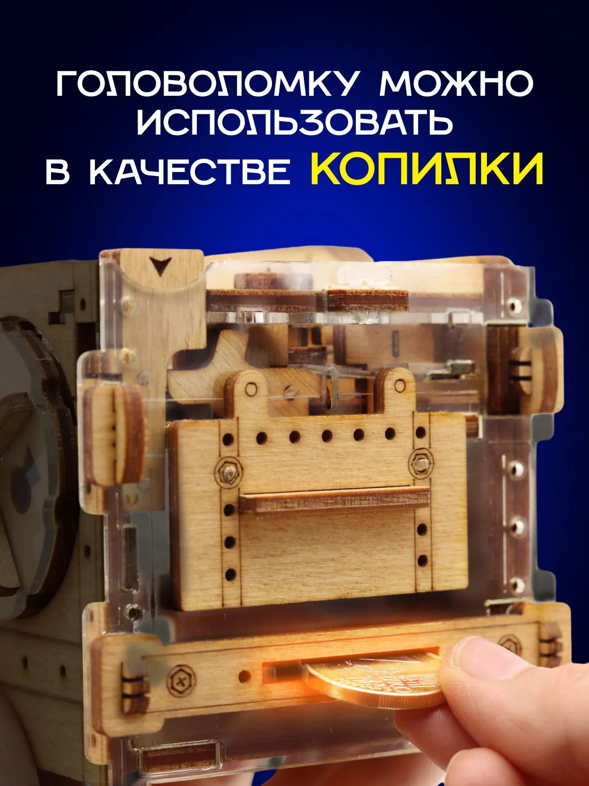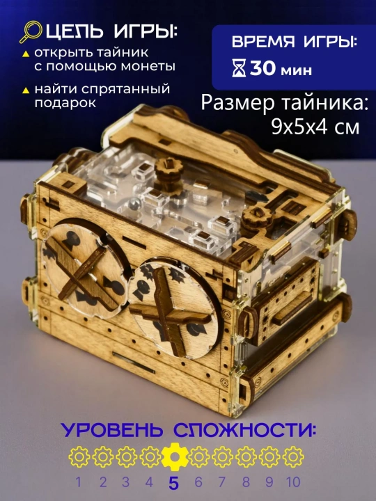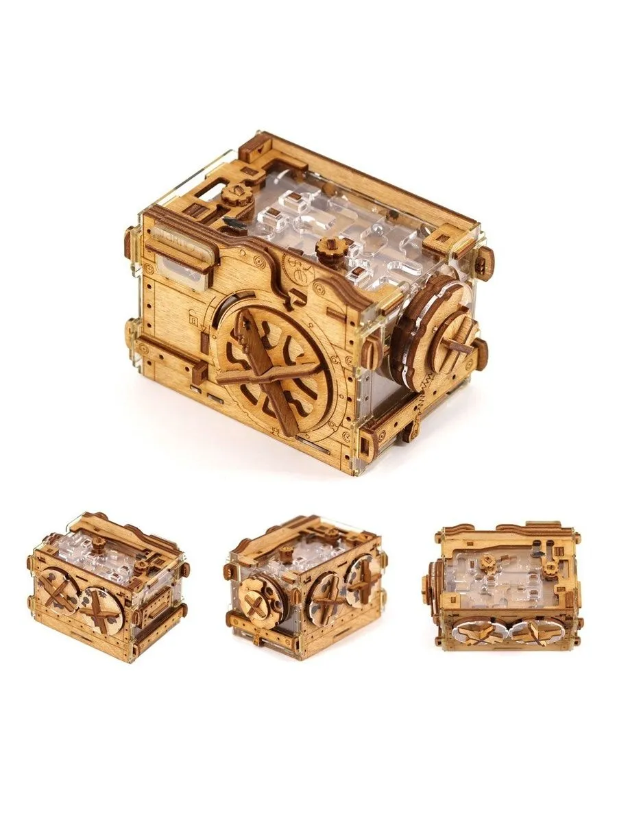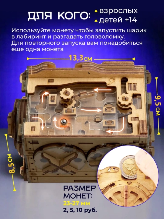 Положите монету — и игра началась! Деревянная головоломка «Копилка» предлагает пройти череду испытаний: решите загадки, проведите шарик через лабиринт и получите доступ к спрятанному «золоту».