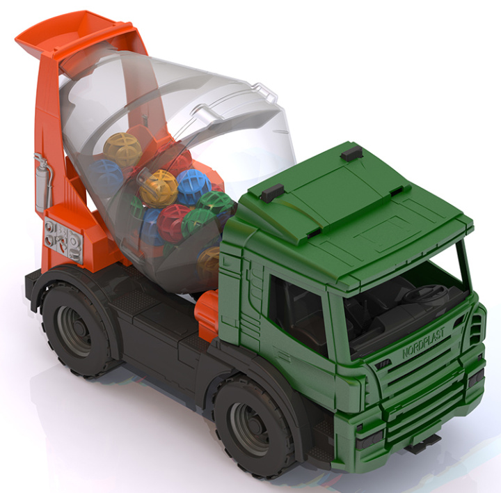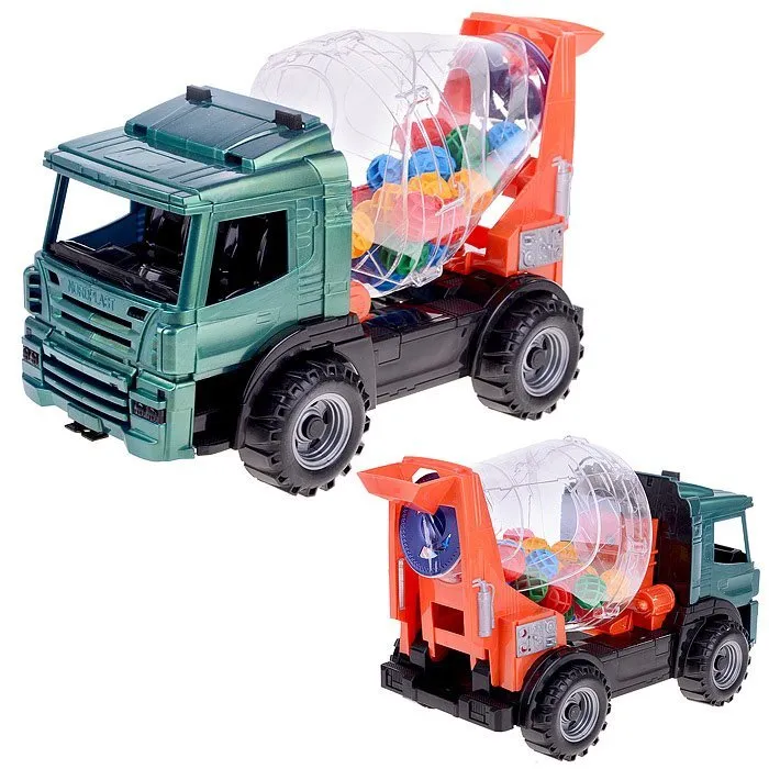 Машинка представляет собой уменьшенную копию настоящей бетономешалки, барабан которой крутится и заполнен цветными шариками.