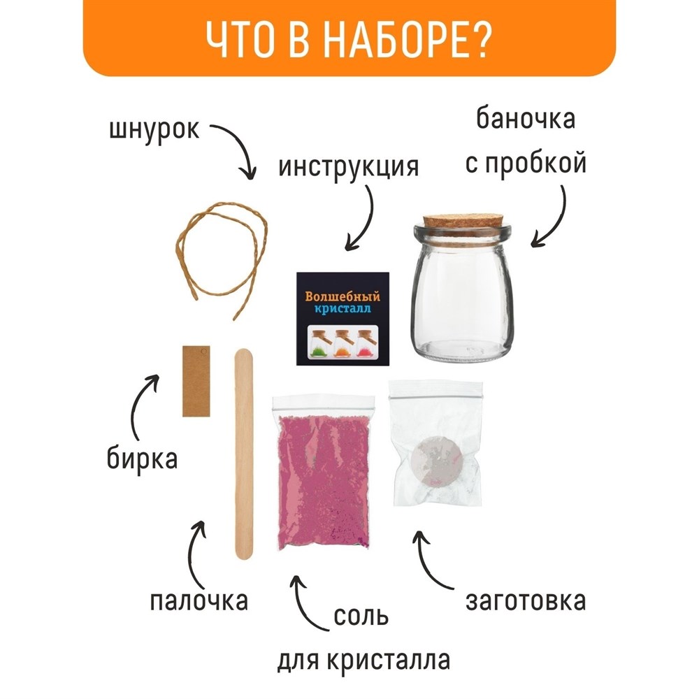 В комплекте: баночка с пробкой, кристаллический порошок, основа для кристалла, палочка для перемешивания, шнурок, бирка с пожеланием, инструкция на русском языке