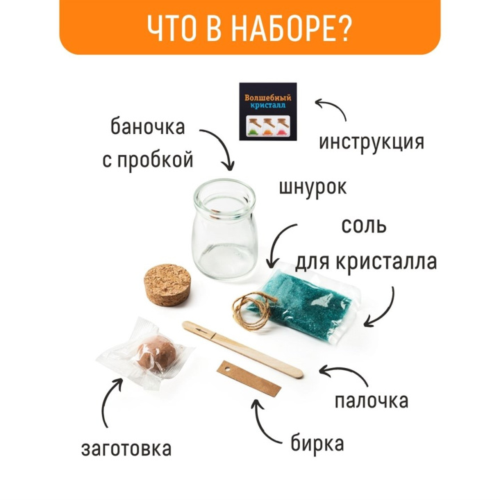 В каждом наборе: баночка с пробкой, кристаллический порошок, основа для кристалла, палочка для перемешивания, шнурок, бирка с пожеланием, инструкция на русском языке