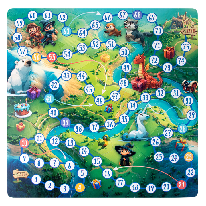 - Двустороннее игровое поле (ходилка + 9 головоломок)