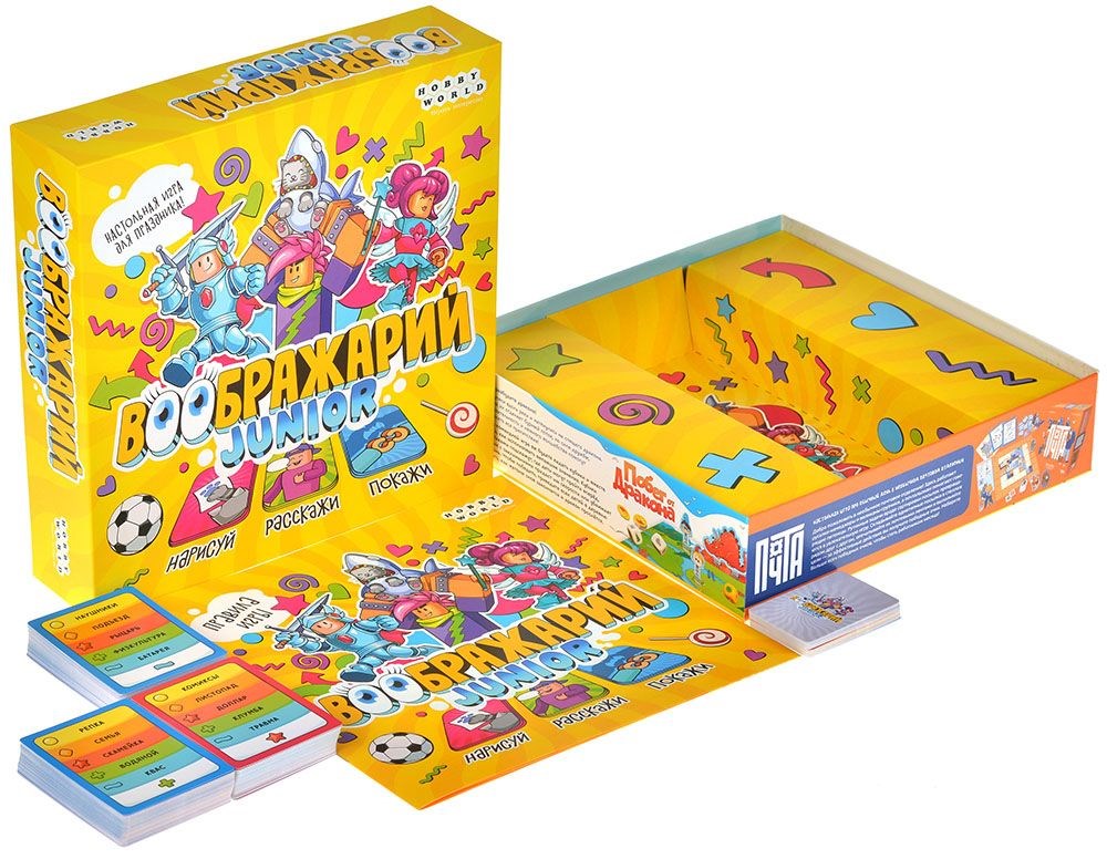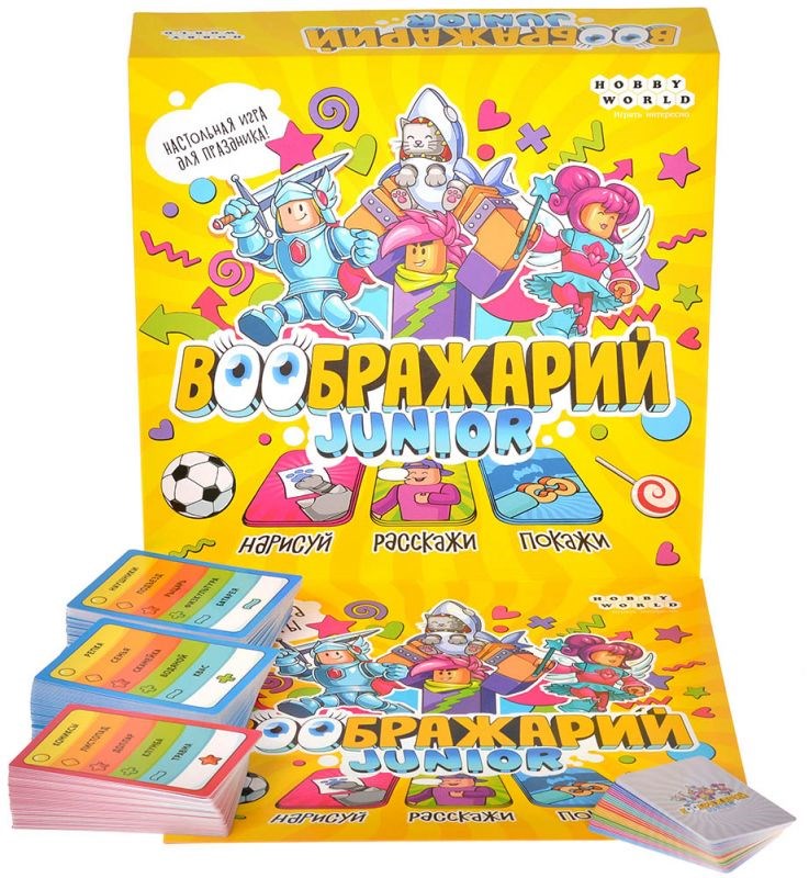 "Воображарий Junior" - это специальная версия популярной игры в ассоциации, созданная для детей от шести лет. Яркий дизайн и тщательно подобранный словарь делают игру доступной и интересной для младших школьников, при этом два уровня сложности позволяют адаптировать gameplay под разный возраст. Три варианта объяснения слов - рассказом, рисунком или представлением - обеспечивают разнообразие и раскрывают творческие способности детей. Игра идеально подходит для семейного досуга, детских праздников и развития коммуникативных навыков в увлекательной игровой форме.