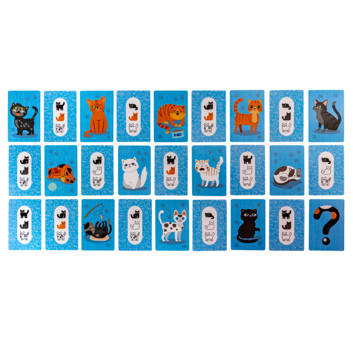 Перемешайте все карточки и разложите их на столе таким образом, чтобы образовался квадрат 7х4, в центре которого будет находиться карта-выручалка в виде вопроса. Участники по очереди кидают кубики. Результат броска определяет свойства, по которым игрокам нужно узнать кота. Тот игрок, который узнал своего персонажа первым, накрывает карточку ладонью, проверяет, совпали ли символы, и забирает карту себе.