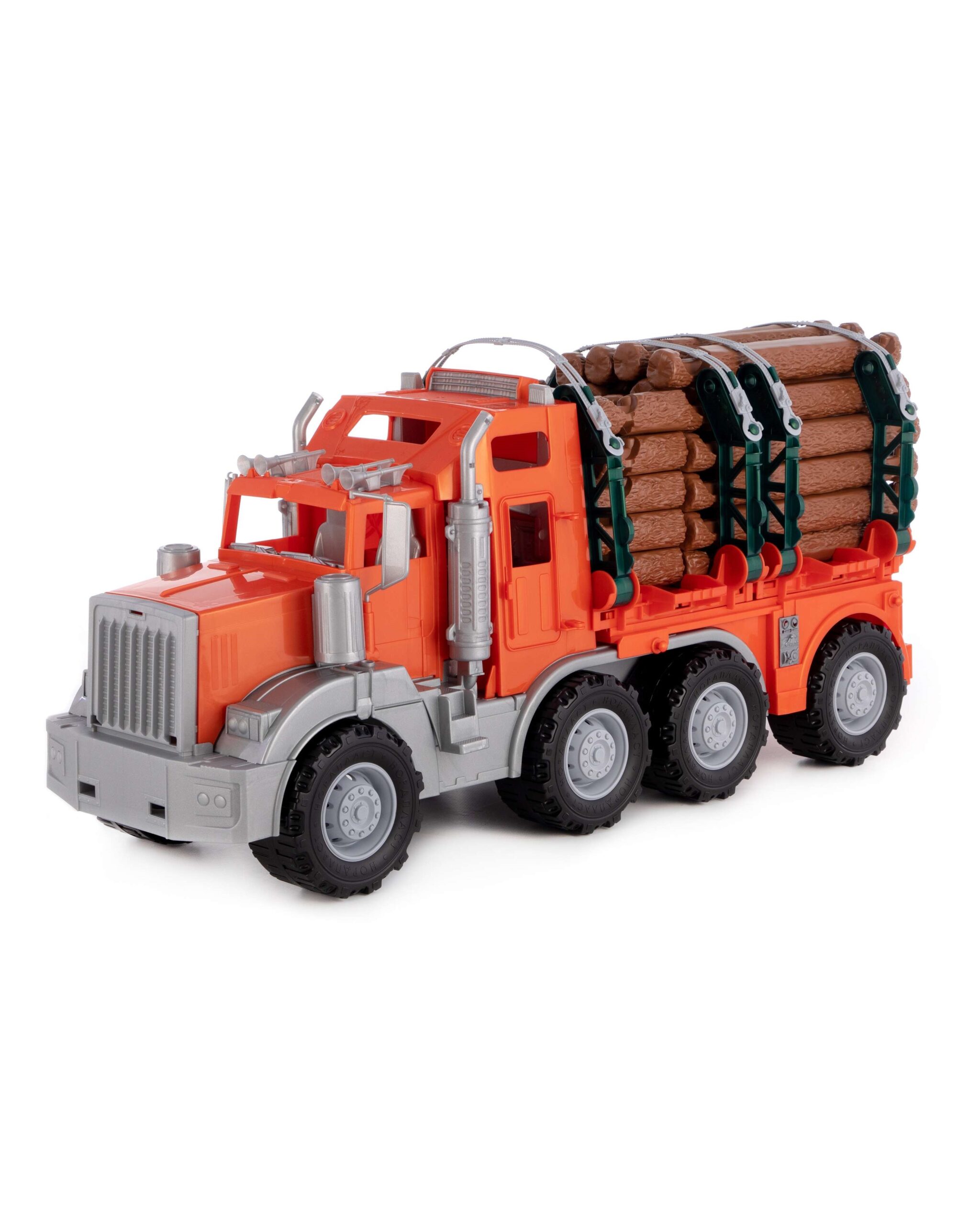 Это не просто большой грузовик, а огромный тягач, созданный по образу и подобию своих настоящих собратьев!  Проходимость в любой местности обеспечивают 4 пары рельефных колес на металлических осях, специализированная конструкция прицепа обеспечивает надежную фиксацию и последующую транспортировку бревен. В последствии из них собирается избушка. Отличительная особенность тягачей подобного типа – комфортабельная кабина водителя, в которой есть всё необходимое для длительного путешествия: постельное место, холодильник, стол, плита и даже телевизор! Поездка на такой машине превращается в одно удовольствие. Помимо этого тягачи знакомят ребенка с различными видами техники, их особенностями и принципом действия, развивают мелкую моторику, воображение, делают игры максимально реалистичными!