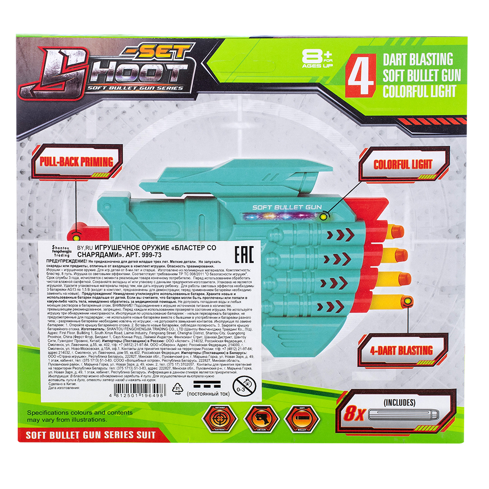 В комплекте: пистолет, 8 пуль, 3 батарейки AG13.