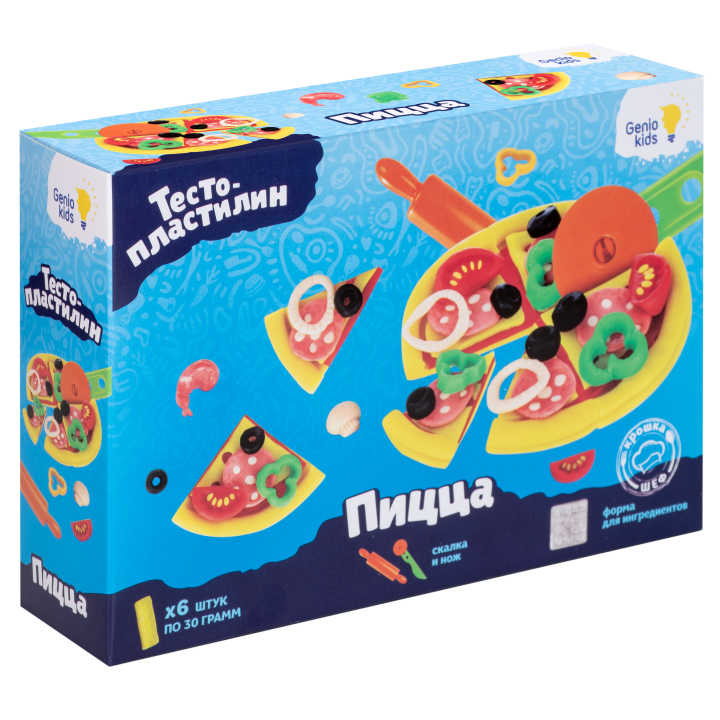 В наборе: тесто-пластилин 6 шт. по 30 г, скалка, нож для пиццы, блистер для декора.