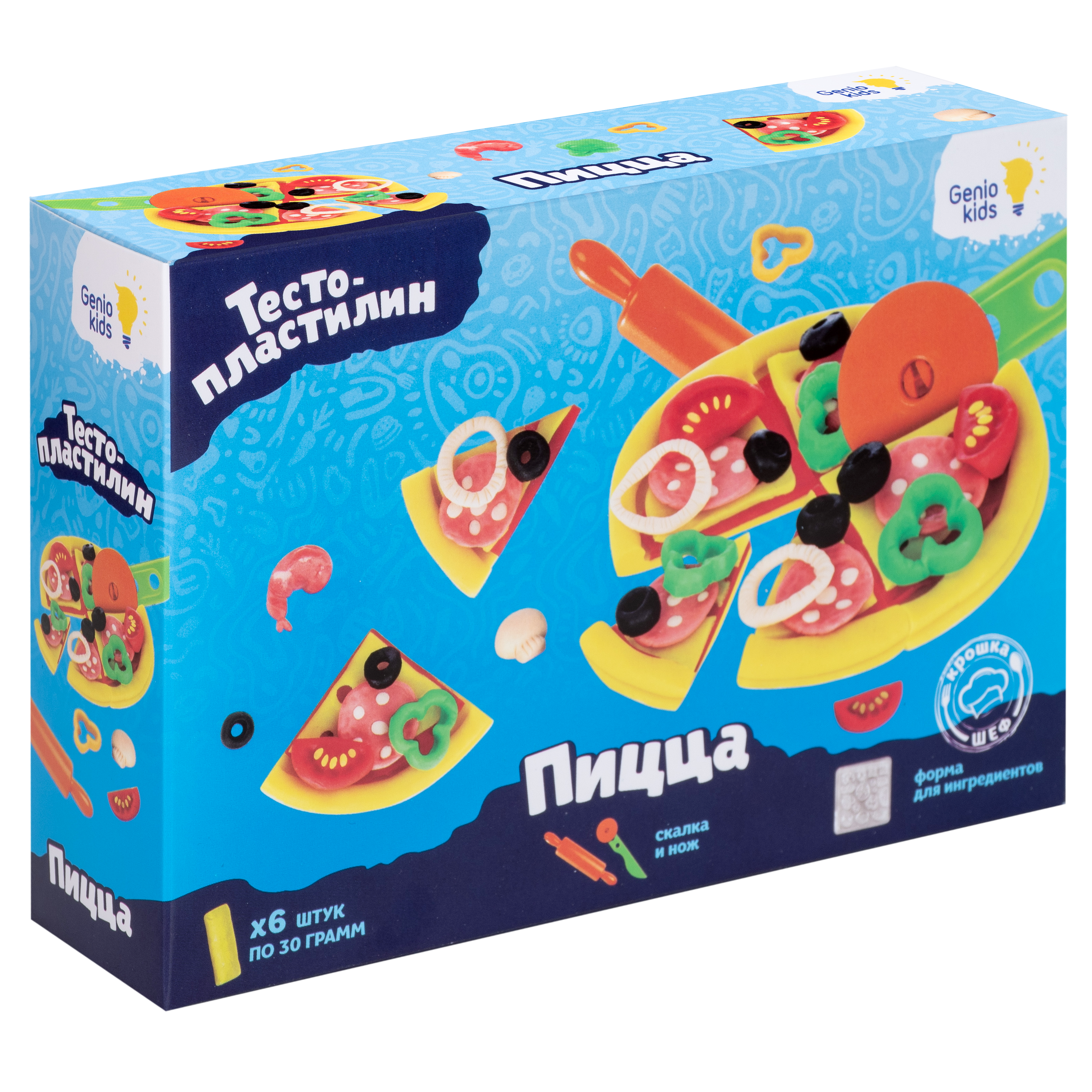 В наборе: тесто-пластилин 6 шт. по 30 г, скалка, нож для пиццы, блистер для декора.