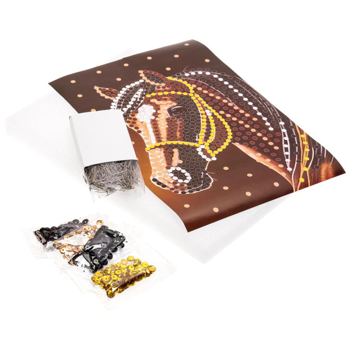С помощью красочной основы и сверкающих пайеток, прикрепляемых к ней гвоздиками, ребёнок сможет самостоятельно создать красивую блестящую картину с изображением гнедой лошади.