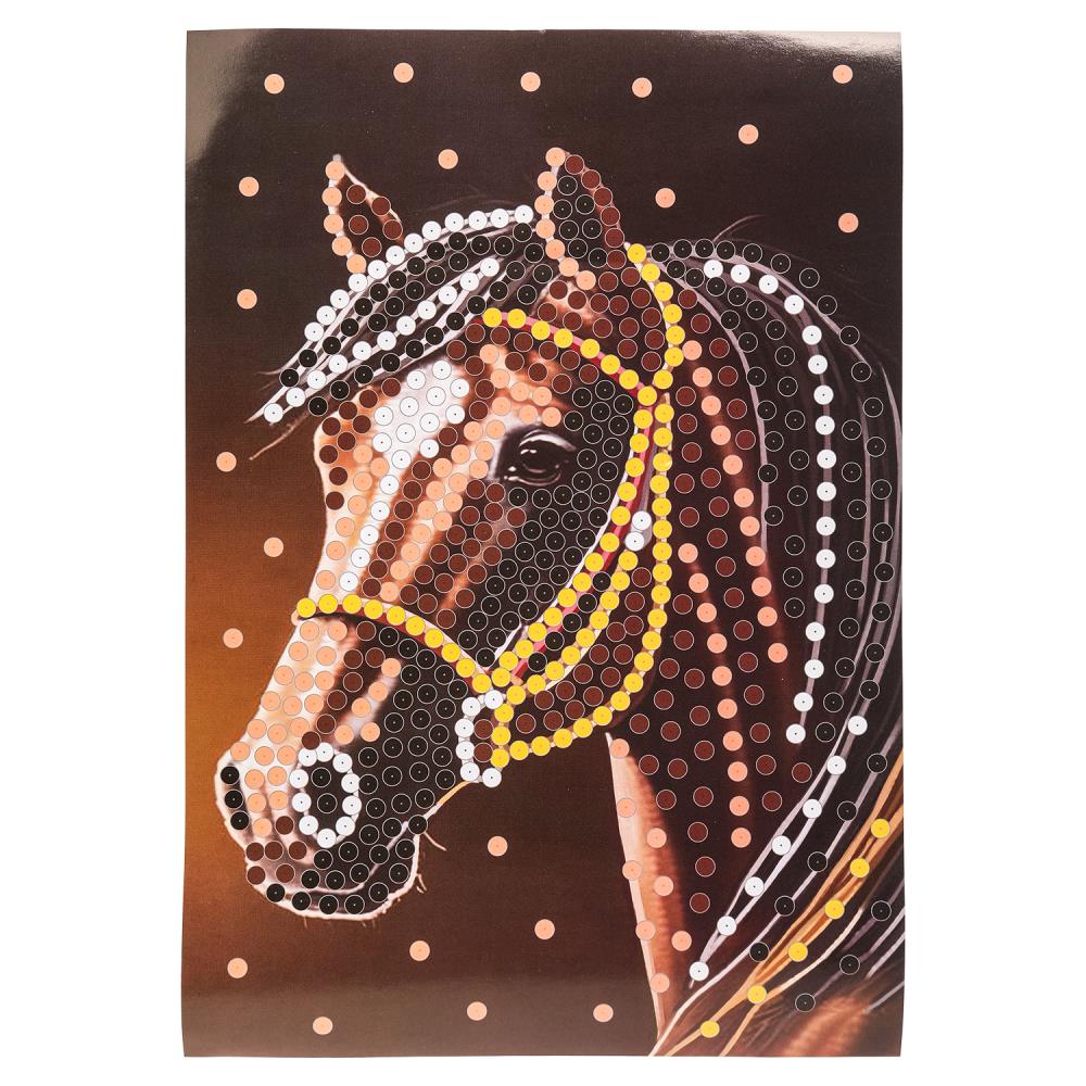 С помощью красочной основы и сверкающих пайеток, прикрепляемых к ней гвоздиками, ребёнок сможет самостоятельно создать красивую блестящую картину с изображением гнедой лошади.