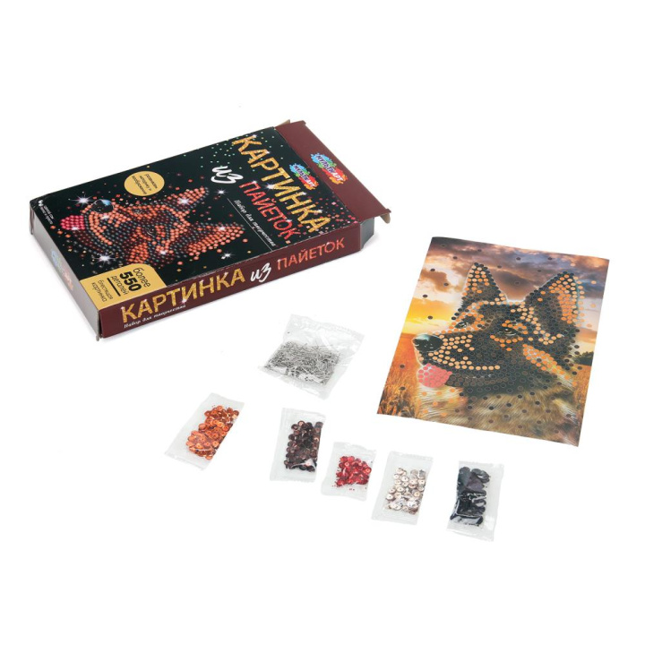 С помощью красочной основы и сверкающих пайеток, прикрепляемых к ней гвоздиками, ребёнок сможет самостоятельно создать красивую блестящую картину с изображением симпатичной собаки. Готовую поделку можно подарить близким или использовать для украшения интерьера.