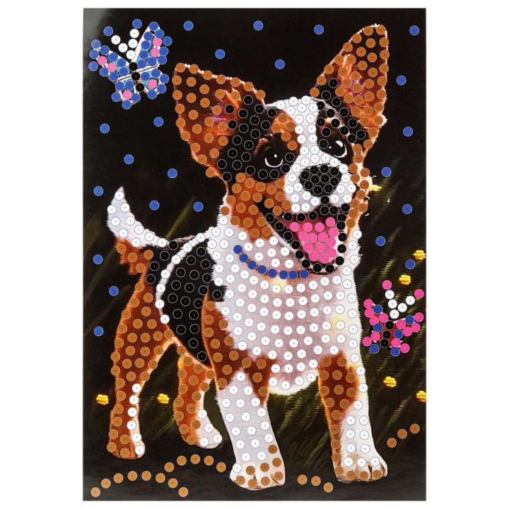 С помощью красочной основы и сверкающих пайеток, прикрепляемых к ней гвоздиками, ребёнок сможет самостоятельно создать красивую блестящую картину с изображением милой собачки.