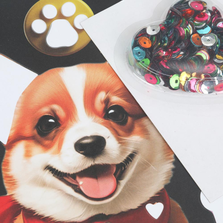 С помощью этого набора юный художник сможет самостоятельно создать сверкающую аппликацию с изображением милой собачки.