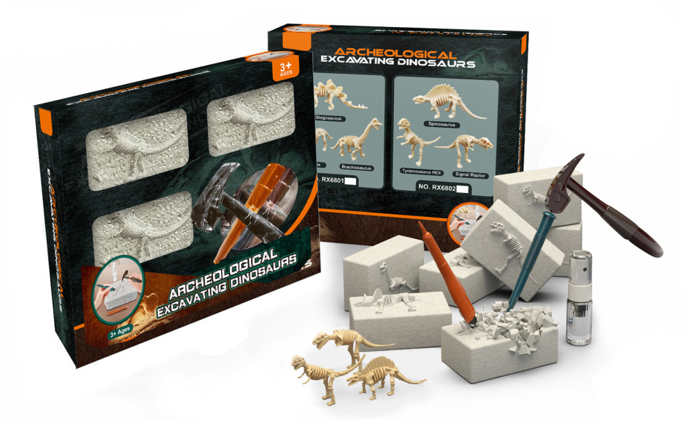 - Набор «3 в 1» позволяет провести три полноценные раскопки с разными окаменелостями.